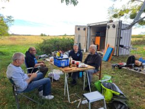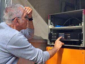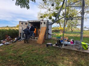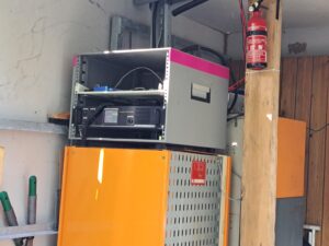 Une petite équipe (Eric F5NNN, Bernard F1AFT, Pierre F6DZT, Christian F4LJZ, Fred F4EOP) a donc passé un samedi entier à nettoyer le container, vider le surplus entassé depuis 10 ans, refaire un câblage anarchique, préparer et implanter le nouveau matériel et… le tester in situ.